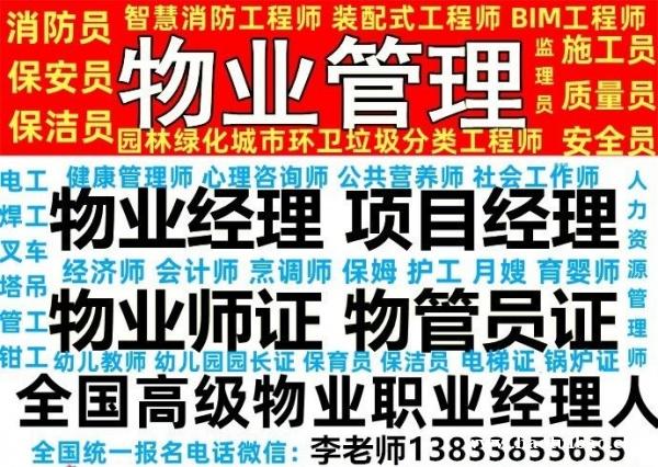 全国物业企业经理、物业项目经理,人力资源社会保障部职业技能。保育员,高级电焊工,质监局叉车、锅炉工、安监局高低压电焊工,高空作业,住建厅安全员,施工员,土建施工员(工长),水暖施工员,电气施工员,市政施工员,资料员,物业企业上岗证书,材料员,质检员,工程施工员、工程质量检验员、工程资料员、工程材料员、水暖施工员 电气施工员等,团报优惠。